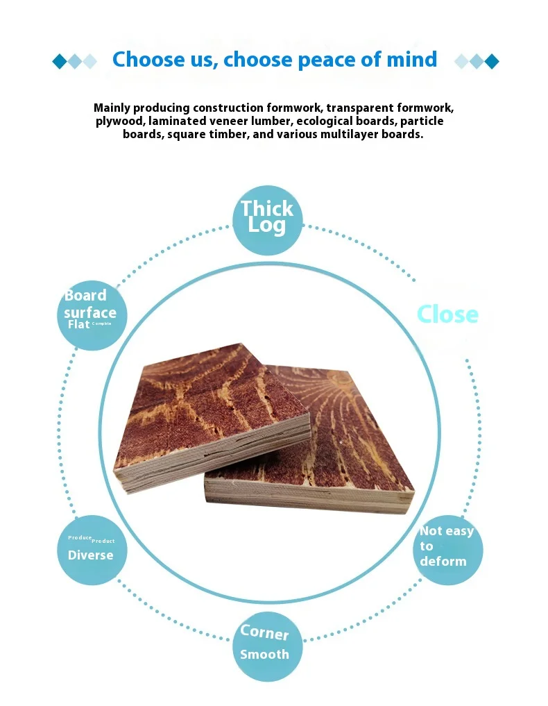Ang Dinghaode’s Red High-Rise Building Plywood ay gawa sa kahoy na may mataas na kalidad na maingat na pinili at pinoproseso upang matugunan ang mga pangangailangan ng modernong konstruksyon. Ang ibabaw nito na clear water board ay makinis at waterproof, na nagiging perpekto ito para gamitin sa formwork. Ibig sabihin, mas kaunting pagsipsip ng tubig ang inaasahan, na tumutulong upang maprotektahan ang kahoy laban sa pagbubuhol, pagkurap, at pinsala habang ginagamit. Ang tibay ng plywood ay nagsisiguro na maaari itong gamitin nang maraming beses, na nagiging isang matipid na solusyon para sa mga kontraktor at tagapagtayo.